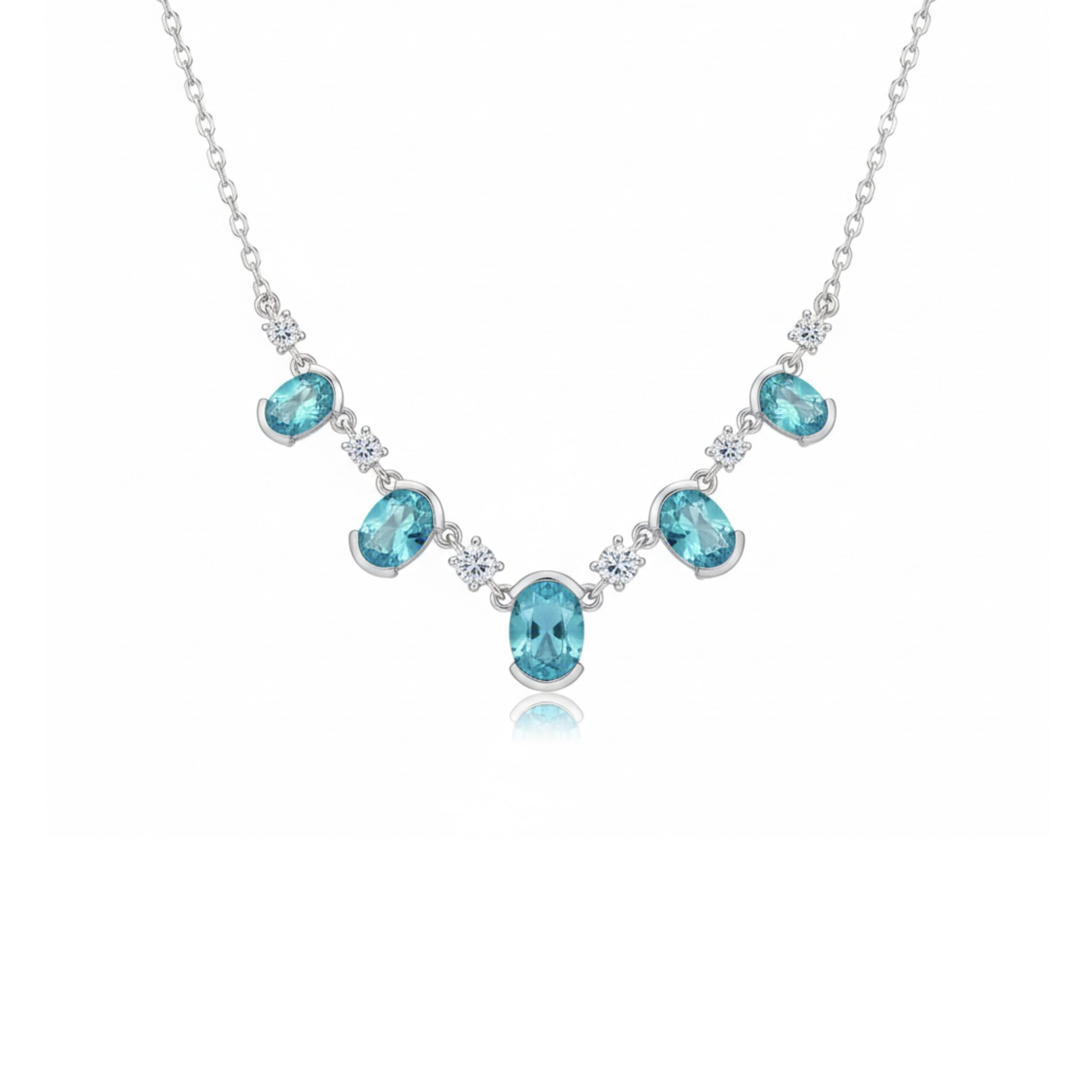 This necklace features a beautifully balanced layout of aqua blue oval stones and twinkling zircon connectors, set in hypoallergenic 925 silver. The design flows gracefully on the collarbone, making it perfect for date nights, brunches, or gifting. Lightweight, minimal, and high-impact.